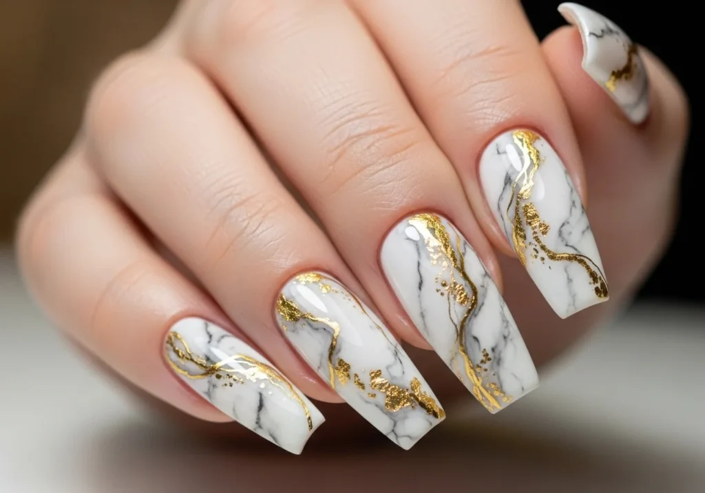 Marble nails mimic the look of real stone with swirling white, grey, and gold tones. On acrylic nails, the marble effect looks ultra-luxurious and high-end without the high price tag.