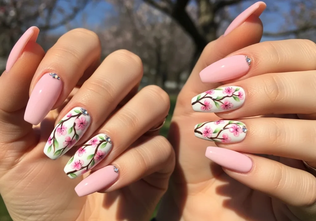 Pastel shades, cherry blossom designs, and soft lilac tones rule spring. Pair a soft pink base with hand-painted white flowers for the ultimate spring nail art look that feels fresh and romantic.