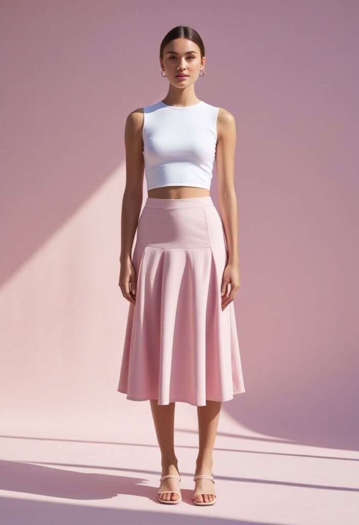 The feminine midi skirt paired with a cropped cardigan offers vintage charm with modern sensibility.