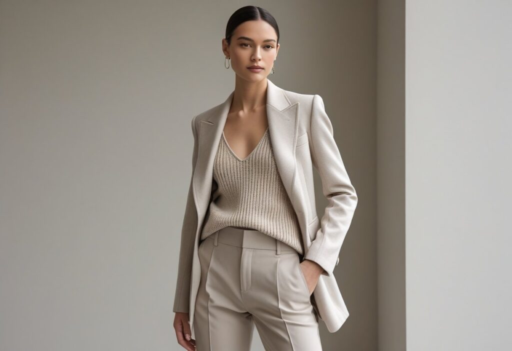 - Build your outfit around a single neutral base: beige, cream, taupe, or soft grey