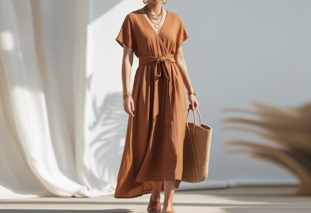 The flowing maxi dress remains a summer essential, especially in 2026’s favored earth tone palette. This effortless piece offers both coverage and breathability.