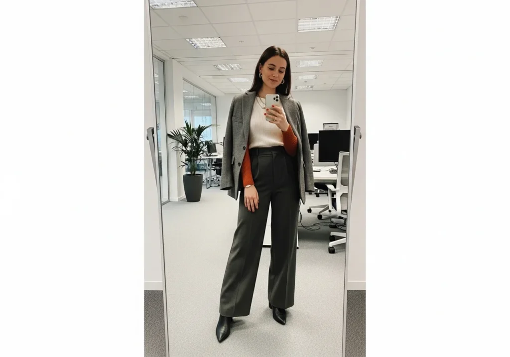 Wide-leg pants are still a strong trend in 2026. Style them with a fitted tank tucked in at the waist. Add a structured blazer on top for a polished finish. Choose neutral tones like camel, oatmeal, or slate. Finish with pointed flats or low block heels.
