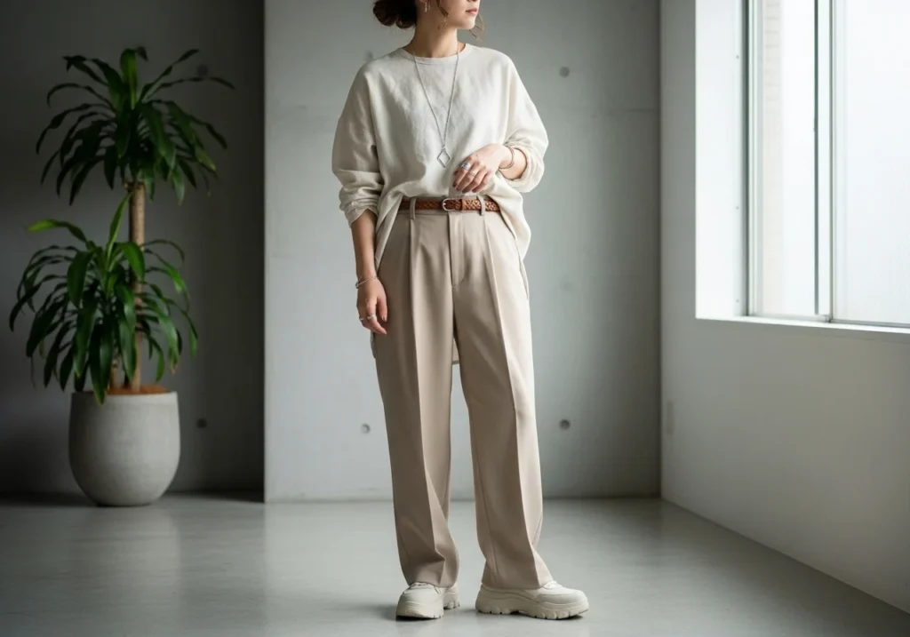 Linen pants, a boxy tee, and flat sandals create a relaxed everyday outfit that feels comfortable and stylish. Choose neutral tones like beige, cream, or warm grey. Keep accessories minimal a small gold necklace and a simple bag are all you need.