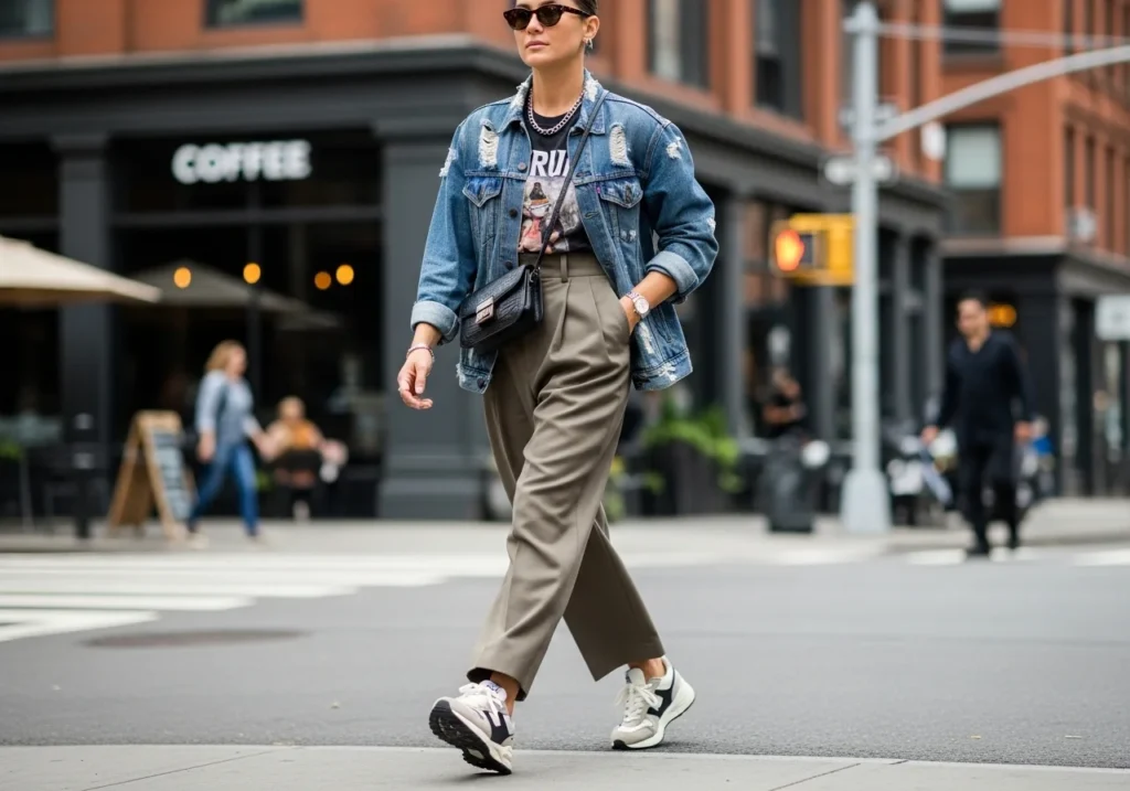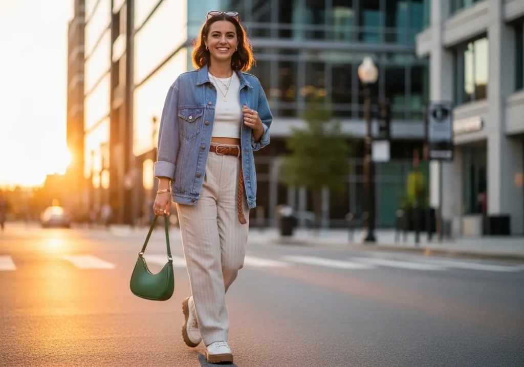 Street style is bold and confident. Cargo pants, a fitted crop jacket, chunky boots, and a crossbody bag create a strong street-ready silhouette. Mix textures like denim, leather, and cotton. Add a cap or beanie for an extra edge. The goal is to look styled but effortless.