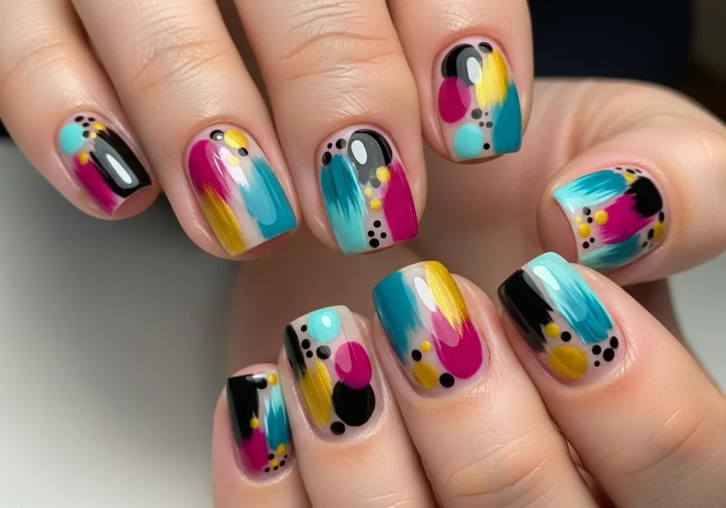 Abstract Nail Art Bold brushstrokes, asymmetric shapes, and artistic color blobs make each nail a tiny piece of art. Abstract designs are unique, expressive, and no two sets look exactly the same which is exactly the point.